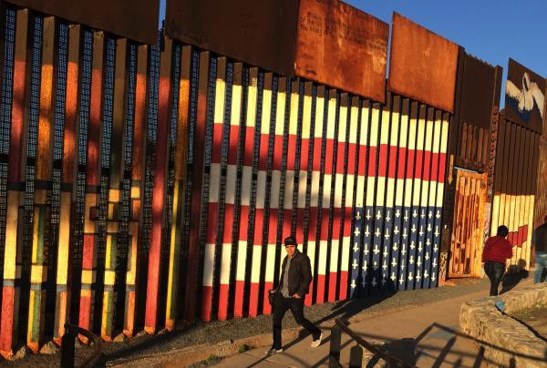 当地时间2017年1月25日,墨西哥提华纳,一名男子从美墨边境墙旁边走过。 东方IC资料