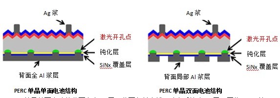 PERC单晶双面电池背面由全Al层改为局部Al层,因此背面的入射光可由未被Al层遮挡的区域进入电池,实现双面光电转换功能。由于激光开孔点仍然需要Al浆来疏导光生电流,因此背面的大部分区域任然覆盖了Al浆,因此和电池正面超过20%的光电转换效率相比,PERC单晶双面电池背面可吸收光线的区域有限,背面的光电转换效率预计在10-15%。同时由于背面由全Al层改为局部Al层,电池的正面效率可能会下降0.2-0.5%。