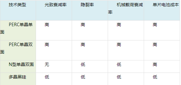 光致衰减方面,多晶黑硅光衰约为1.5%,N型单晶基本没有光衰,而PERC单晶的光衰在2-10%之间,从而导致PERC单晶组件应用在光伏电站后很可能光电转换效率大幅下降,光伏电站发电量和收益率而随之大幅下降。