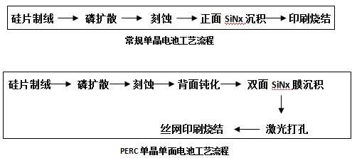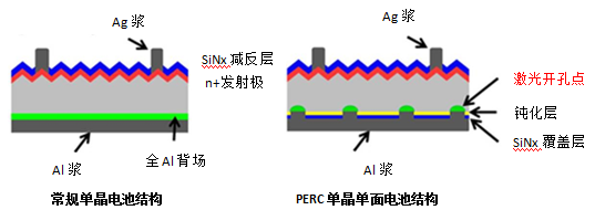 和常规单晶电池工艺相比,PERC单晶电池主要增加了背面钝化、背面SiNx膜沉积和激光打孔三道工艺。其中激光打孔工艺是利用一定脉冲宽度的激光在去除部分覆盖在电池背面的钝化层和SiNx覆盖层,以使丝网印刷的铝浆可以与电池背面的硅片形成有效接触,从而使光生电流可以通过Al层导出。因Al浆无法穿透SiNx层,其余未被激光去除的钝化层被覆盖在其上方的SiNx覆盖层保护,发挥降低表面复合速率,提升效率的作用。