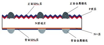 多晶硅片中具有若干不同晶向的晶体,因此单晶广泛应用NaOH溶液各向异性制绒工艺并不适用于多晶制绒。目前通行的多晶硅制绒工艺主要是HF/HNO3混合溶液的缺陷腐蚀制绒法,此方法制绒后的硅片反射率约为18%,高于常规单晶制绒后11%的反射率,不利于多晶电池对入射光线的有效吸收。为了进一步降低多晶硅片制绒后的反射率,采用特殊制绒工艺在多晶硅片表面形成纳米结构,增加有效多晶硅片对入射光线的吸收。采用这种制绒工艺生产的多晶电池有更低的反射率,此方法制绒的多晶电池从肉眼来看比普通多晶电池更黑,因此这种工艺被称为黑硅制绒。