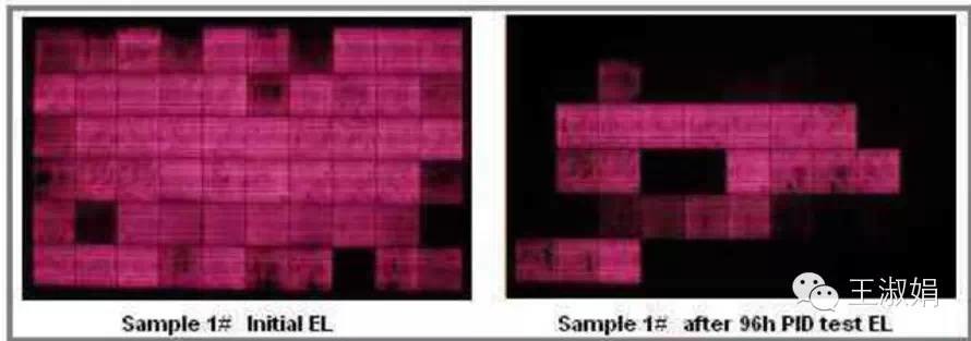 下图为PID效应的红外照片, PID效应严重的电池片发黑。