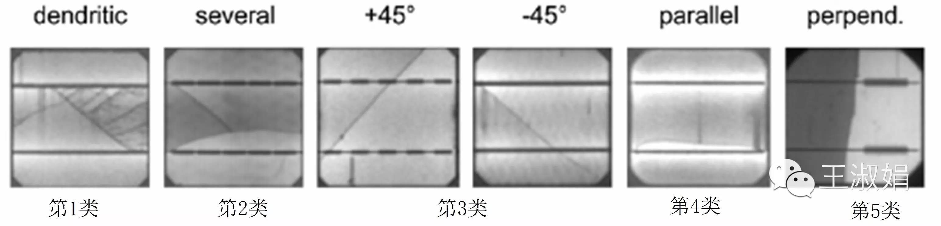 2011年,德国ISFH公布了他们的研究结果:根据电池片隐裂的形状,可分为5类:树状裂纹、综合型裂纹、斜裂纹、平行于主栅线、垂直于栅线和贯穿整个电池片的裂纹。
