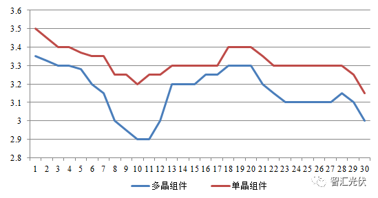 2016年SNEC之前(5月份之前),多晶光伏组件的价格一直维持在3.8元/W左右,6月份后下降10%以上;到8月份的招标时爆出3.05元/W的价格,