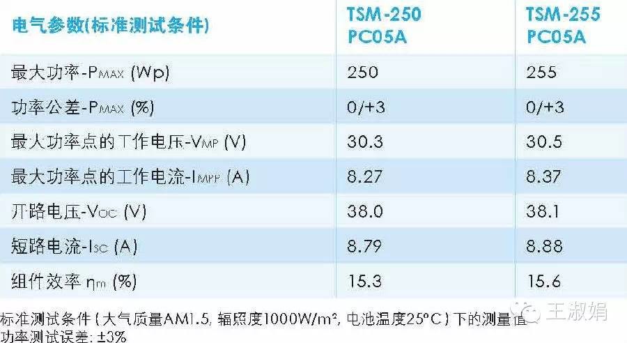 我们常说,采用255Wp光伏组件。下表的“p”为peak的缩写,代表其峰值功率为255W。所有的技术规格书中都会标注“标准测试条件”的。下图为常州天合的光伏组件技术规格书一部分(250W,下同)。