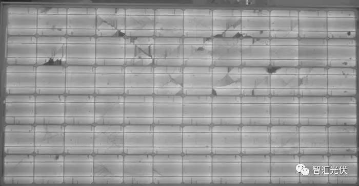 光伏组件在运输、搬运、安装等过程中,容易被踩踏、撞击,导致组件产生不易察觉的隐裂,极大影响组件输出功率。用EL变可以检测出来,如下图。