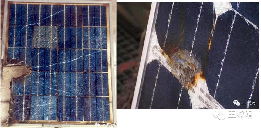 为了防止太阳电池由于热斑效应而遭受破坏,最好在太阳电池组件的正负极间并联一个旁路二极管,以避免光照组件所产生的能量被受遮蔽的组件所消耗。当热斑效应严重时,旁路二极管可能会被击穿,令组件烧毁,如下图(图片来自于TUV-Rheinland)。